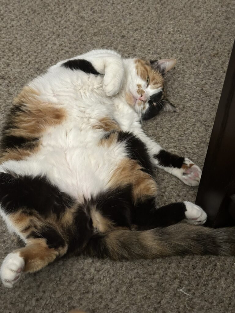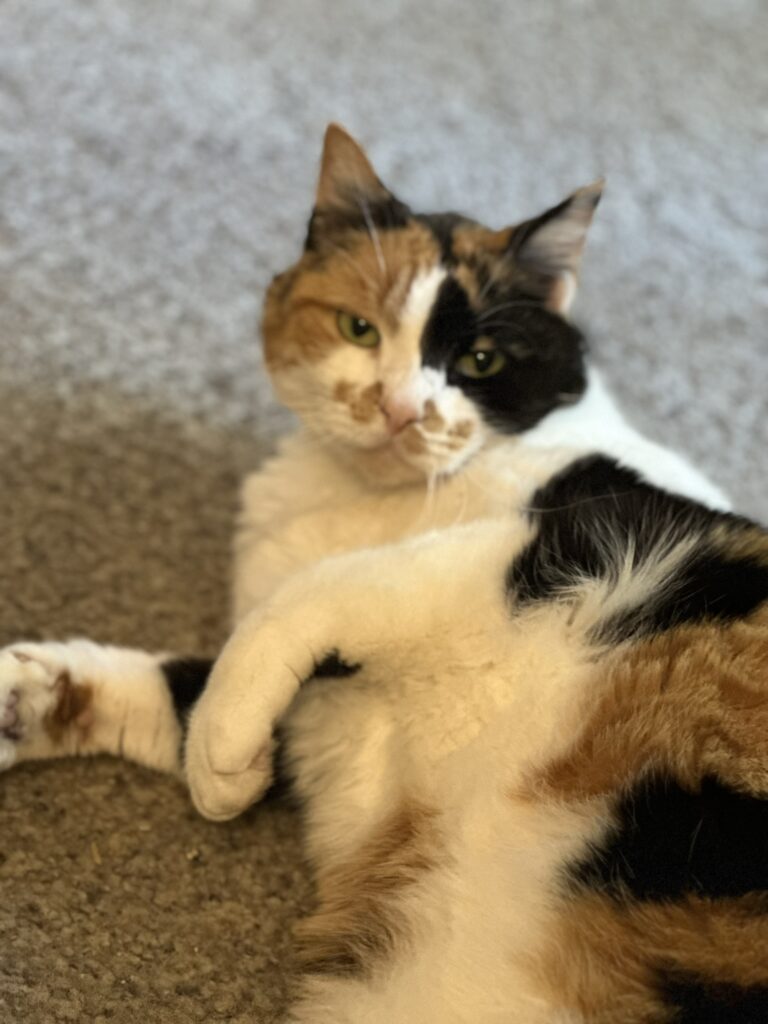She hasn’t jumped on my lap yet, but when I’ve lifted her up she stays for a few minutes…as long as she’s being scratched. Callie LOVES having her back and cheeks scratched. And unlike many cats, she seems to like belly rubs. She’s pretty talkative, too.