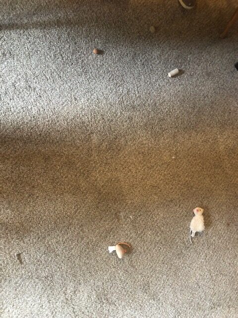 But this afternoon, the toys were scattered several feet apart. This means that CC is PLAYING AT NIGHT.
