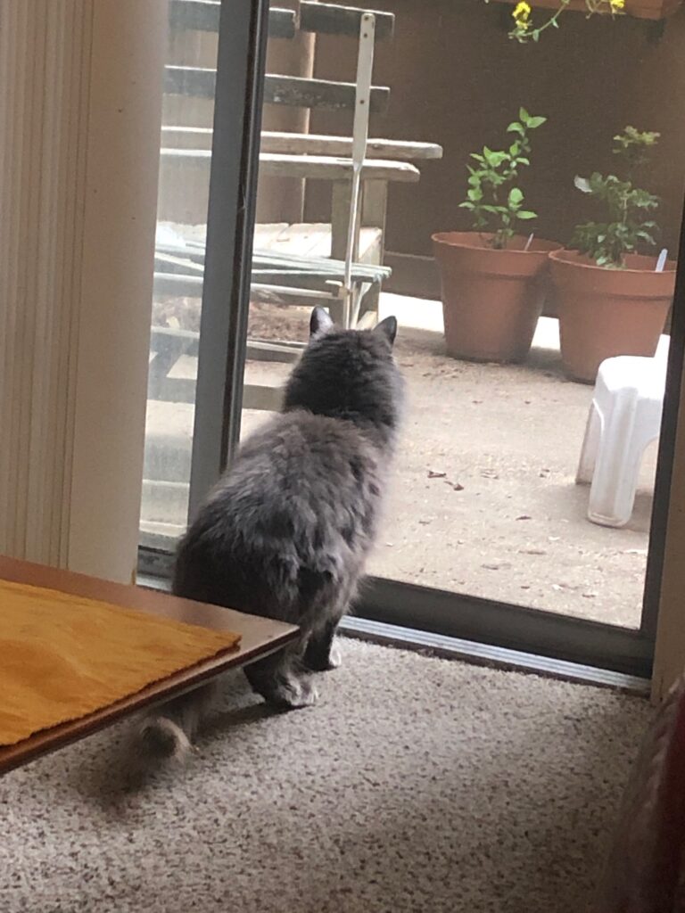CC has had a rough time, and for quite a while. She and another cat lived, indoors, with a family in a rural, heavily wooded part of El Dorado County, but when their family moved away, these “people” turned their cats outdoors and drove off. CC’s name reflects the Coyote Country where she used to live.