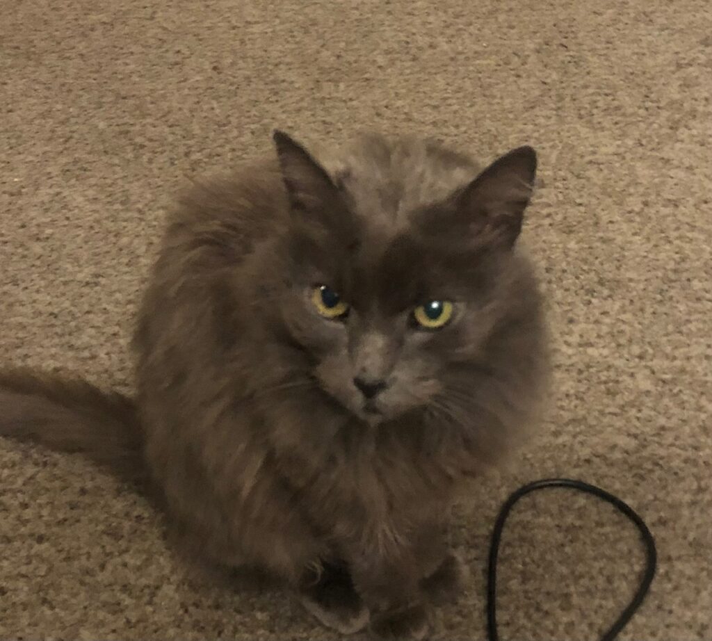 I doubt that CC weighs more than about three pounds; her fluff disguises her frail body. But her appetite is good—she eats canned and dry food indifferently—so I know she’ll fill out.