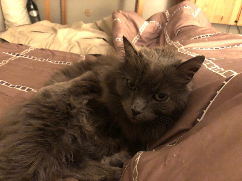 The nearest neighbor, a quarter-mile away, became aware of the two cats living in the woods up the road and started putting out a can of wet food every day. This was a kind gesture but hardly enough to sustain two adult cats. Eventually, CC’s step-sibling succumbed to the elements or, more likely, to a coyote.