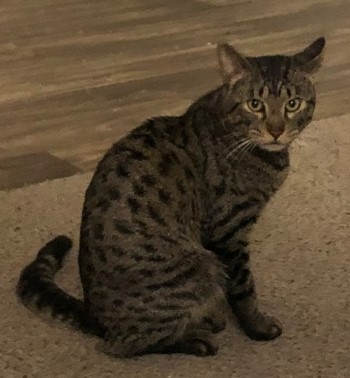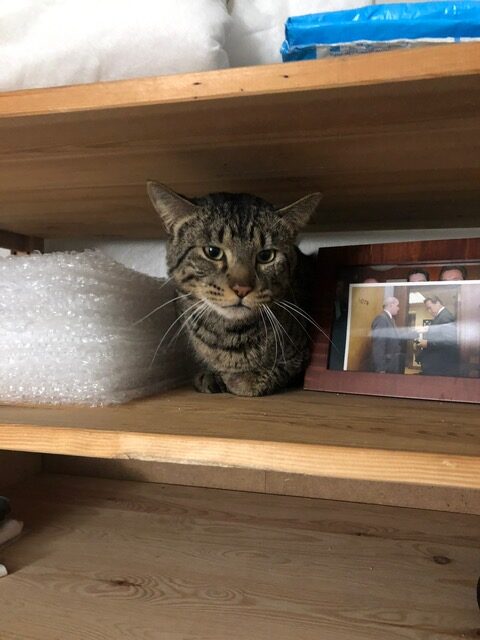 Rip is a Bengal, and I confess to not knowing a thing about the breed before yesterday. His distinctive leopard-like markings are obvious. Bengals are known to be playful, energetic and curious. They also like high places; Rip found a shelf to hang out in for a while.